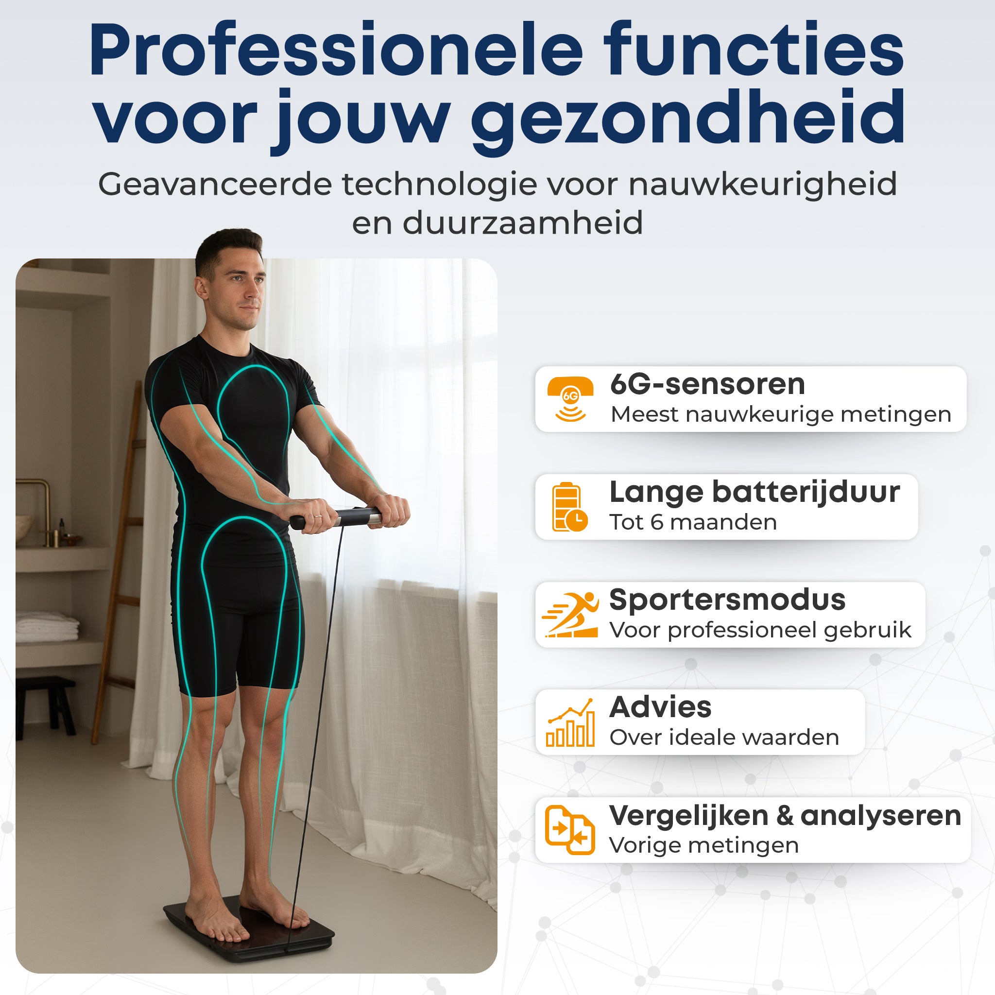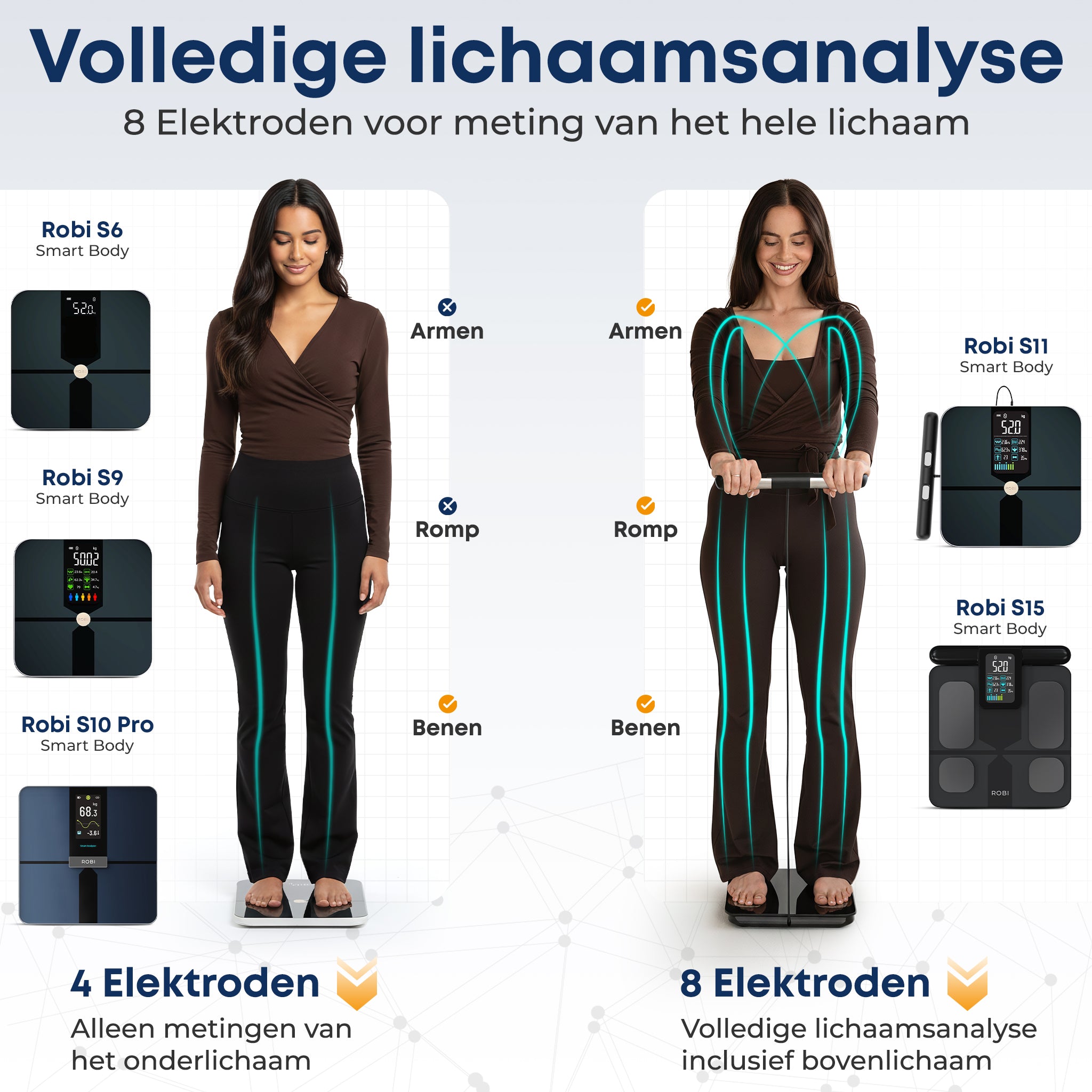 Een gewone meting gebruikt 4 elektroden en geeft één totaalbeeld van je lichaam. De Robi S15 heeft 8 elektroden, 4 in de voetplaat en 4 in het handvat, waardoor hij ook je armen, benen en romp apart analyseert. Zo zie je per lichaamsdeel waar spiermassa en vet zich bevinden en zijn de resultaten nog nauwkeuriger.