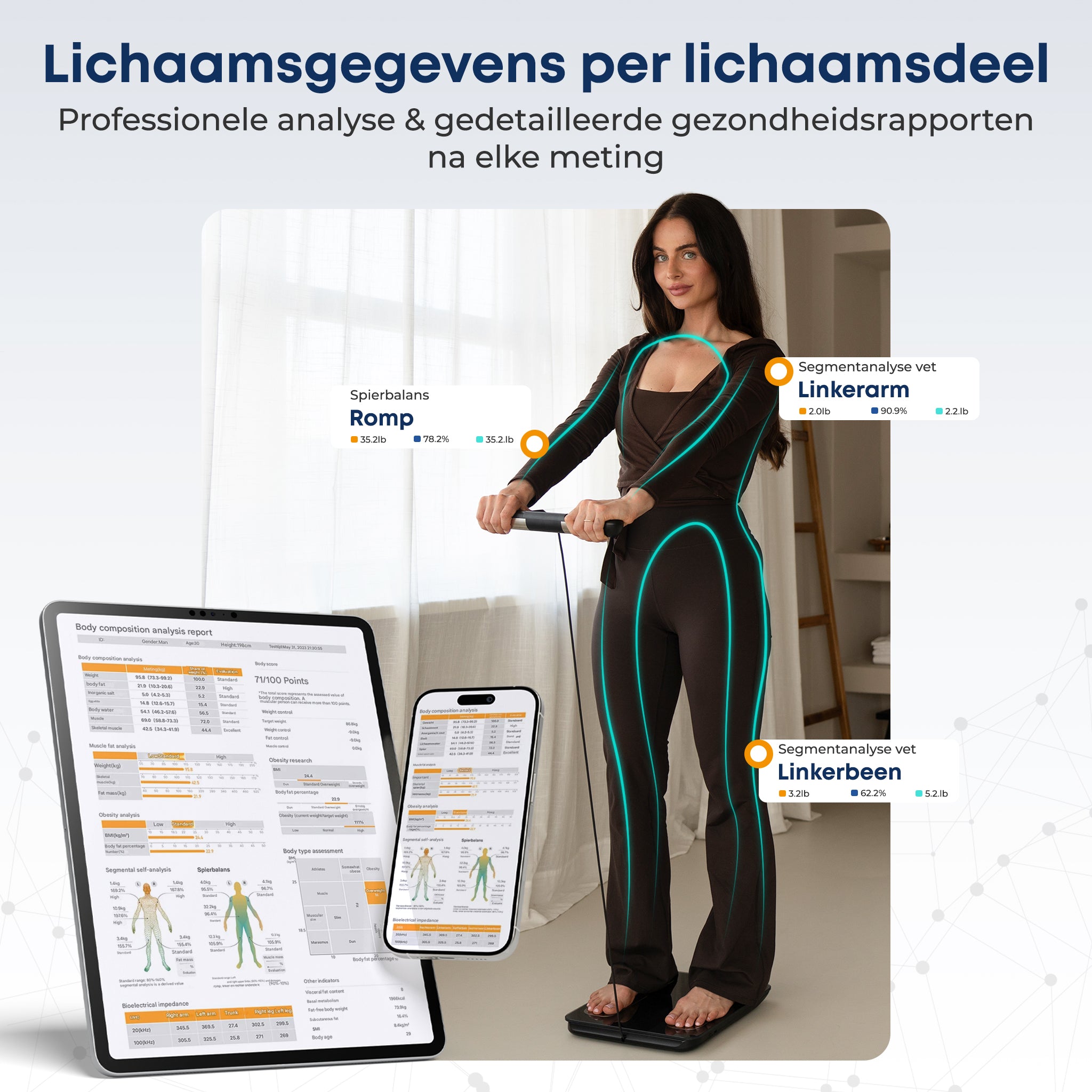 Een gewone weegschaal ziet alleen je totaalgewicht en mist daardoor belangrijke details. Deze analyse per lichaamsdeel laat juist wél de belangrijke veranderingen zien. Krijg een helder inzicht in de verhouding tussen spieren en vet in je armen, benen en romp, en krijg de bevestiging dat je training werkt.