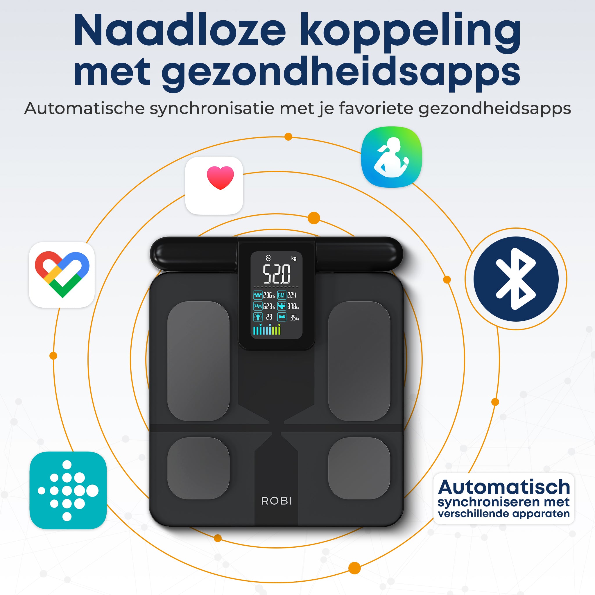 Ja. De Robi S15 synchroniseert automatisch via de App met Apple Health, Samsung Health en Fitbit. Je hoeft dus niet handmatig gegevens over te zetten: iedere weging verschijnt direct in je favoriete gezondheidsapp, samen met je andere fitnessdata zoals stappen of hartslag. Zo heb je één compleet overzicht van je gezondheid, altijd up-to-date en op elk apparaat.