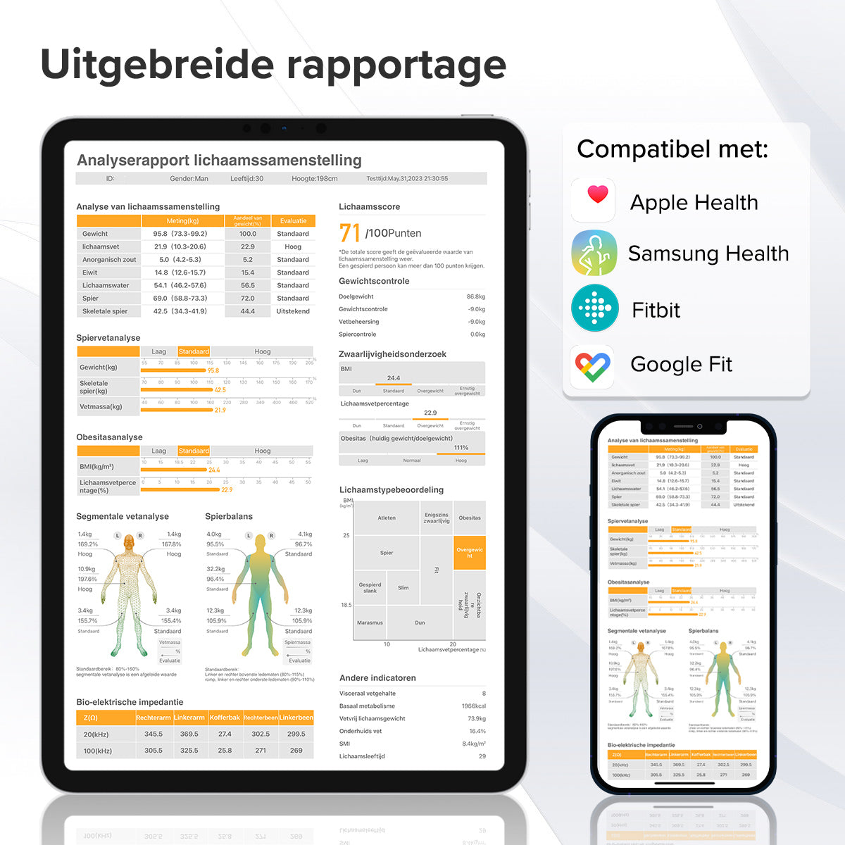 Na elke meting genereert de Robi S15 een uitgebreid rapport met gedetailleerde informatie over je lichaamssamenstelling, waaronder vetpercentage, spiermassa, botmassa en watergehalte per lichaamssegment.